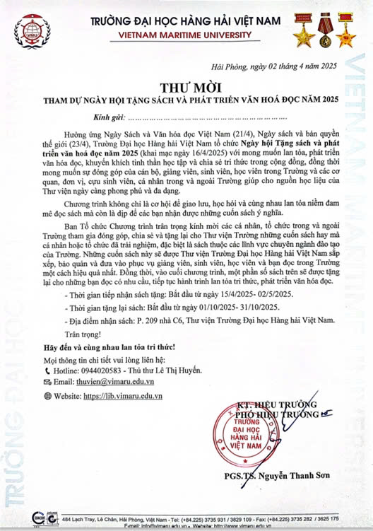 Ban Tổ chức Chương trình trân trọng kính mời các cá nhân, tổ chức trong và ngoài Trường tham gia đóng góp, chia sẻ và tặng lại cho Thư viện Trường những cuốn sách hay mà cá nhân hoặc tổ chức đã trải nghiệm, đặc biệt là sách thuộc các lĩnh vực chuyên ngành đào tạo của Trường. Những cuốn sách này sẽ được Thư viện Trường Đại học Hàng hải Việt Nam sắp xếp, bảo quản và đưa vào phục vụ giảng viên, sinh viên, học viên và bạn đọc trong Trường một cách hiệu quả nhất. Đồng thời, vào cuối chương trình, một phần số sách trên sẽ được tặng lại cho những bạn đọc có nhu cầu, tiếp tục hành trình lan tỏa tri thức, phát triển văn hóa đọc.